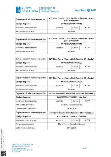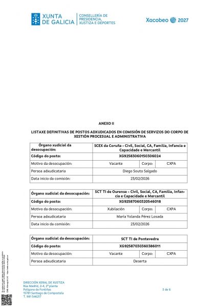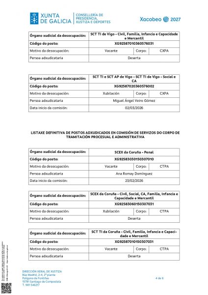 O 4 de febreiro de 2026 publicouse na intranet de Xustiza e máis na web da Consellería de Presidencia, Xustiza e Deportes a resolución da Dirección Xeral de Xustiza, pola que se convoca a provisión de postos de traballo entre persoal funcionario dos corpos e escalas ao servizo da Administración de xustiza.