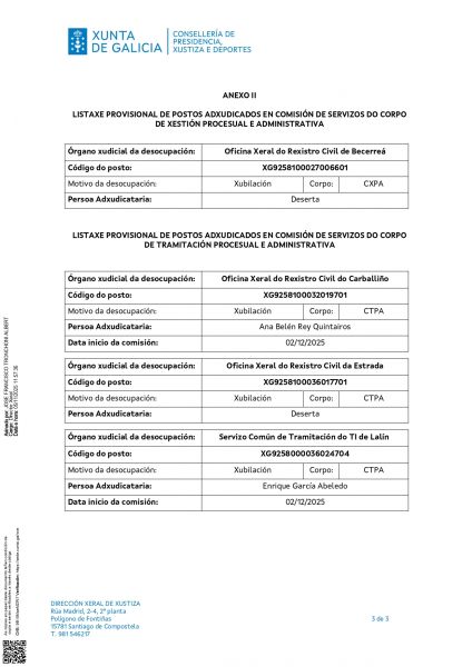 O 10 de setembro de 2025 publicouse na intranet de Xustiza e máis na web da Consellería de Presidencia, Xustiza e Deportes a Resolución da Dirección Xeral de Xustiza, pola que se convoca a provisión de postos de traballo entre persoal funcionario dos corpos e escalas ao servizo da Administración de xustiza.