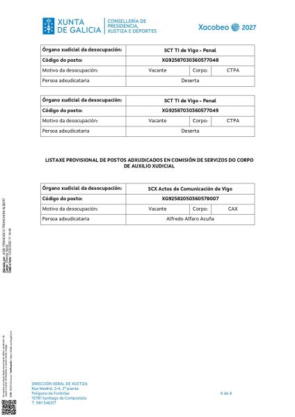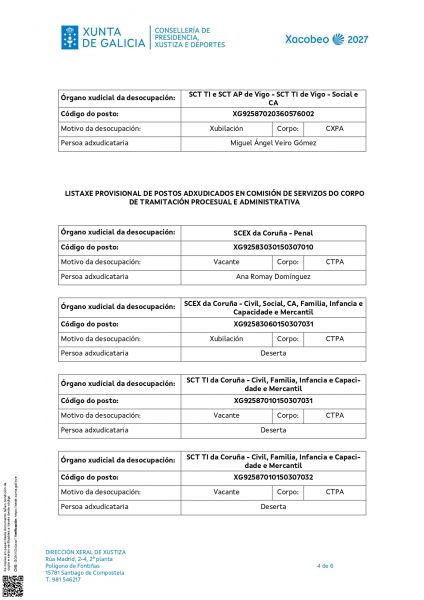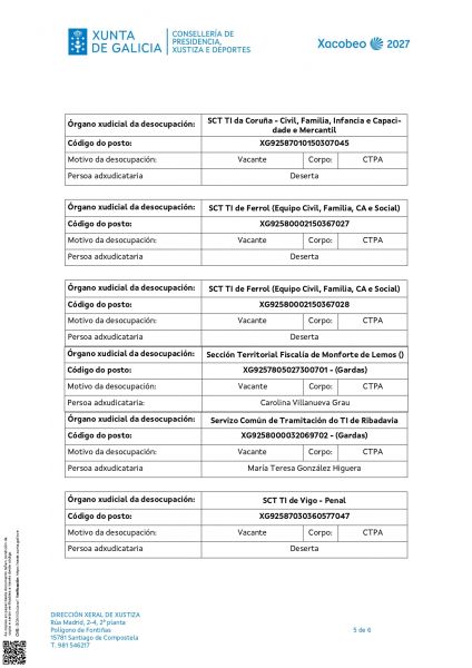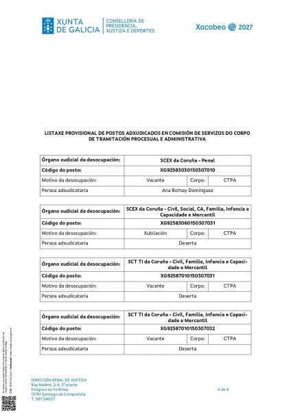 O pasado 4 de febreiro de 2026 publicouse na intranet de Xustiza e máis na web da Consellería de Presidencia, Xustiza e Deportes a resolución da Dirección Xeral de Xustiza, pola que se convoca a provisión de postos de traballo, en comisión de servizos, entre o persoal funcionario dos corpos e escalas xerais ao servizo da Administración de Xustiza.