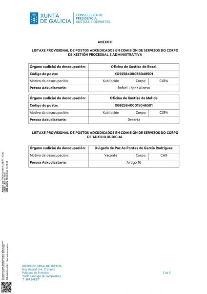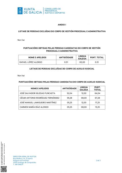 Ven de publicarse na intranet e na páxina web da consellería a Resolución do 18 de setembro de 2025 da Dirección Xearl de Xustiza pola que aproban e fan públicas as puntuacións provisionais obtidas por cada participante da convocatoria así como a listaxe de persoas excluídas e a causa da súa exclusión. Tamén se aproban e fan públicas, no Anexo II da presente resolución, as listaxes das adxudicacións.