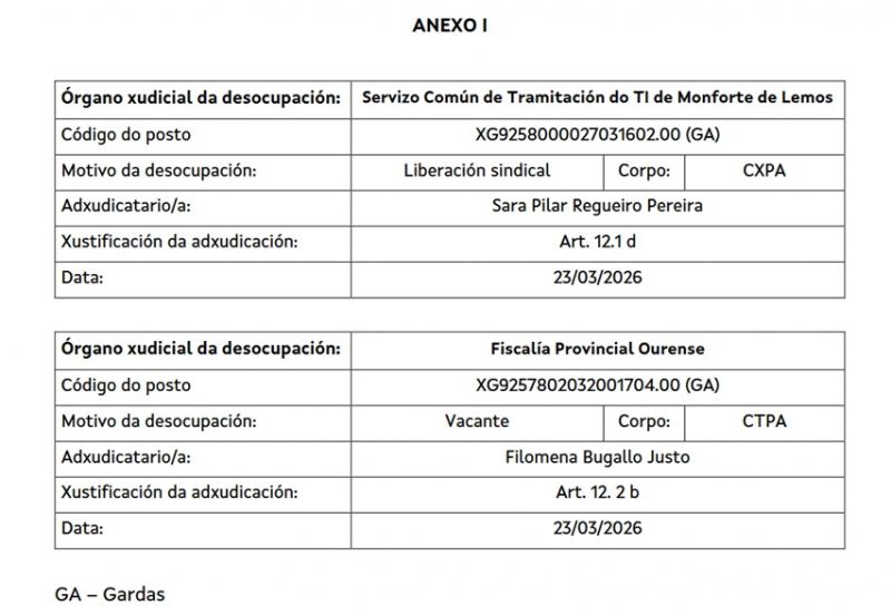 O 11/03/2026 ofertáronse para a súa provisión temporal, mediante o sistema de substitución, diferentes prazas dos corpos xerais ao servizo da Administración de Xustiza.