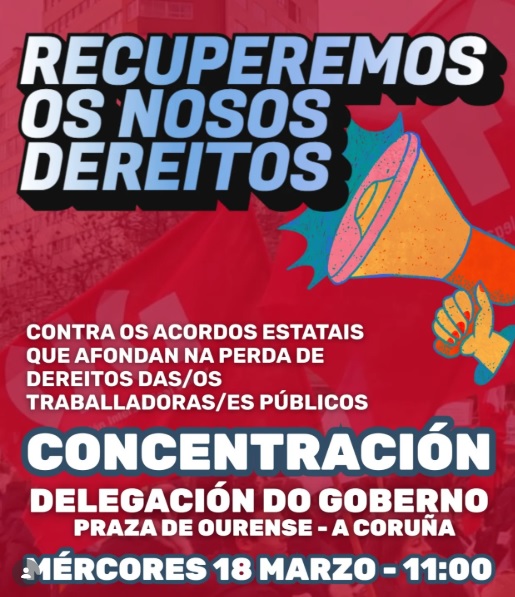 A Área Pública da CIG convoca unha concentración fronte á Delegación do Goberno na Coruña, o próximo mércores, 18 de marzo, ás 11:00 horas, para reclamarlle á administración estatal a toma en consideración das reclamacións recollidas na demanda presentada e admitida a trámite polo Tribunal Central …