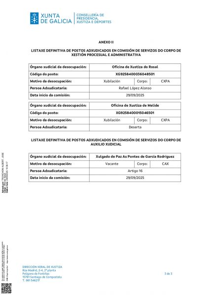 O 10 de setembro de 2025 publicouse na intranet de Xustiza e máis na web da Consellería de Presidencia, Xustiza e Deportes a Resolución da Dirección Xeral de Xustiza, pola que se convoca a provisión de postos de traballo entre persoal funcionario dos corpos e escalas ao servizo da Administración de xustiza.