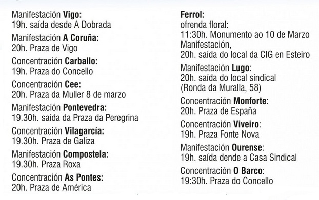 A CIG fai un chamado a converter este 10 de Marzo, Día da Clase Obreira Galega, nunha xornada de mobilización contra a precariedade e a desigualdade, para reivindicar traballo digno e sermos na Galiza un pobo con dereitos. Aínda que o sindicato nacionalista ten convocadas un total de 14 mobilizacións, os actos centrais do día terán lugar en Ferrol, coa tradicional ofrenda floral ao pé do monumento 10 de Marzo, ás 11:30 horas, e cunha manifestación que sairá ás 20:00 horas do local sindical e rematará no Cantón.