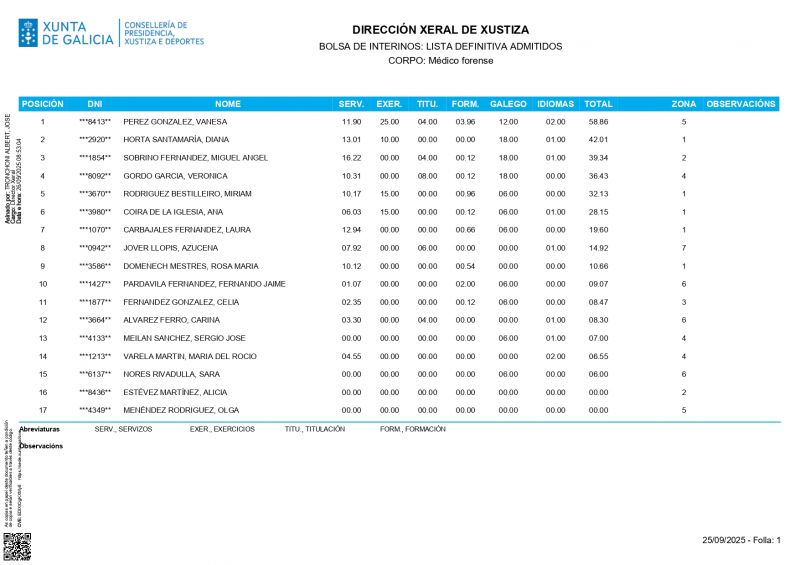 Publicouse na intranet de Xustiza e mais na páxina web da Consellería de Presidencia, Xustiza e Deportes a Resolución do 26 de setembro de 2025 da Dirección Xeral de Xustiza pola que se aproba a listaxe definitiva coas novas persoas admitidas e excluídas das bolsas de persoal interino do corpo de médicos forenses ao servizo da Administración de Xustiza convocadas pola Orde da Consellería de Presidencia, Xustiza e Deportes do 2 de setembro de 2024.