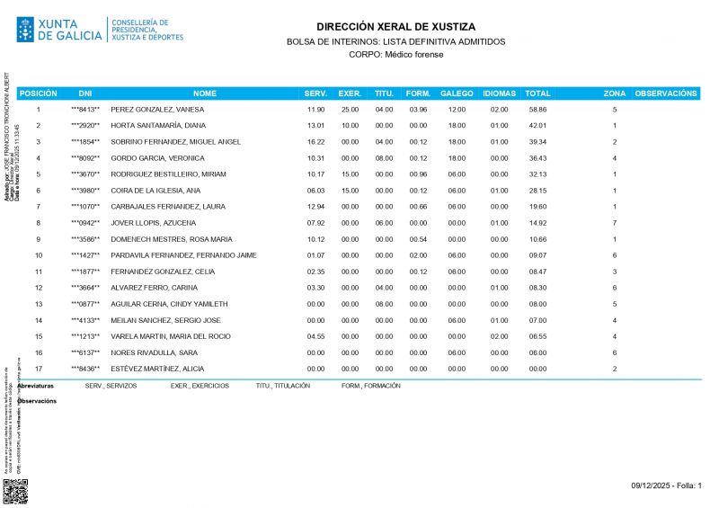 Publicouse na páxina web da consellería e na intranet a Resolución do 9 de decembro de 2025 da Dirección Xeral de Xustiza pola que se aproba a listaxe definitiva coas novas persoas admitidas e excluídas das bolsas de persoal interino do corpo de médicos forenses ao servizo da Administración de Xustiza convocada pola Orde da Consellería de Presidencia, Xustiza e Deportes do 2 de setembro de 2024.