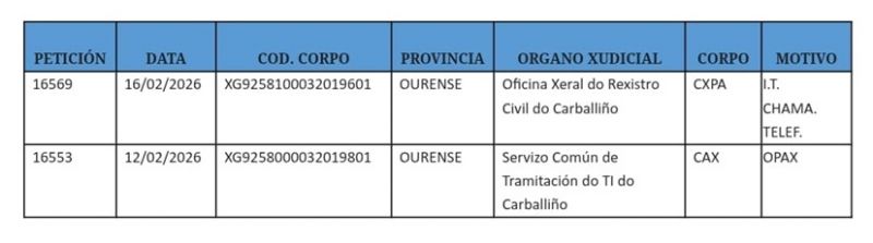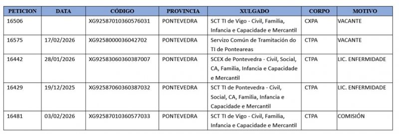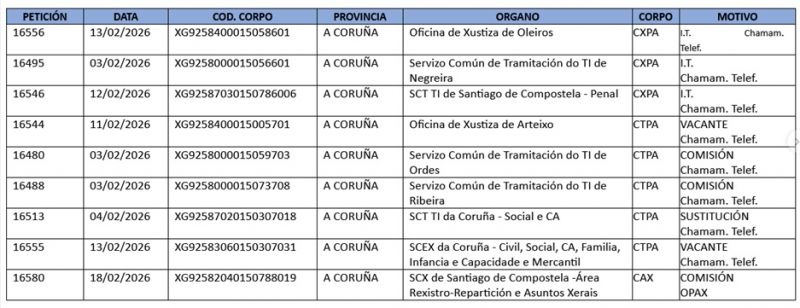 Os respectivos Servizos de Xustiza veñen de comunicar as prazas que a Dirección Xeral de Xustiza autorizou este mercores 18 de febreiro para a súa cobertura por persoal interino.