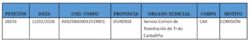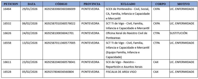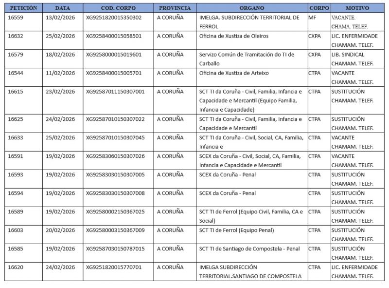 Os respectivos Servizos de Xustiza veñen de comunicar as prazas que a Dirección Xeral de Xustiza autorizou este mercores 25 de febreiro para a súa cobertura por persoal interino.