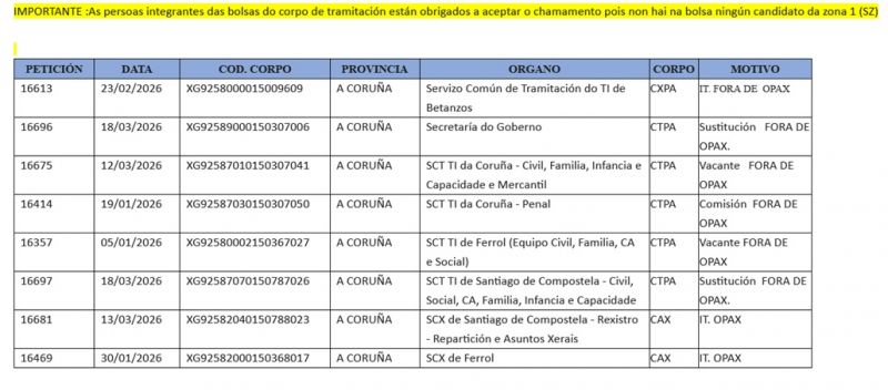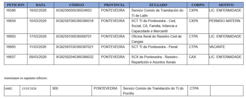 Os respectivos Servizos de Xustiza veñen de comunicar as prazas que a Dirección Xeral de Xustiza autorizou este mercores 18 de marzo para a súa cobertura por persoal interino.