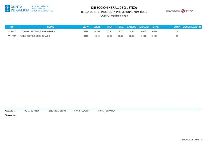 O 20 de abril publicose na intranet e na páxina web da Consellería de Presidencia, Xustiza e Deportes a Resolución do 20 de abril de 2026 pola que se aproba a listaxe provisional de persoas admitidas e excluídas das bolsas de persoal interino do corpo de médicos forenses ao servizo da administración de xustiza convocadas pola orde da consellería de presidencia, xustiza e deportes do 2 de setembro de 2024.
