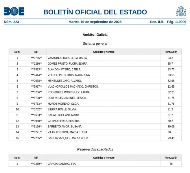 Publicouse no BOE do 16 de setembro de 2025 a Orde PJC/1014/2025, do 4 de setembro, pola que se expón a relación de persoas aprobadas no proceso selectivo para ingreso, polo sistema xeral de acceso libre, mediante oposición, ao Corpo de Auxilio Xudicial da Administración de Xustiza, convocado por Orde PJC/64/2024, de 25 de xaneiro.