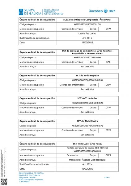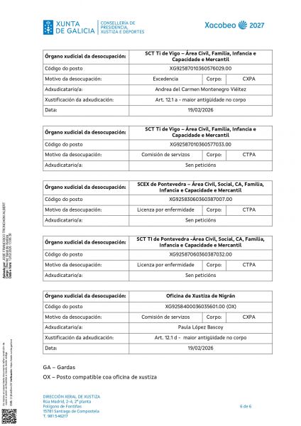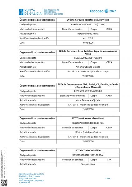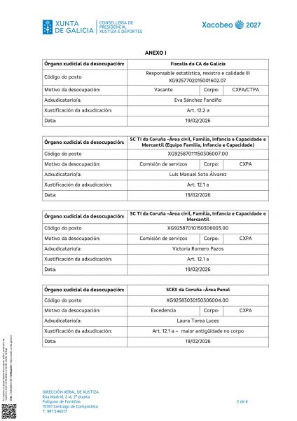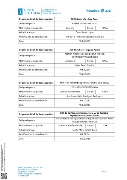 Por Resolución do 12 de febreiro de 2026 a Dirección Xeral de Xustiza ven de publicar a adxudicación definitiva das prazas ofertadas.