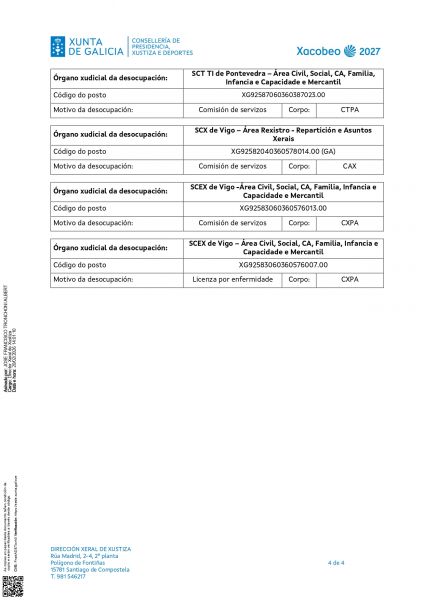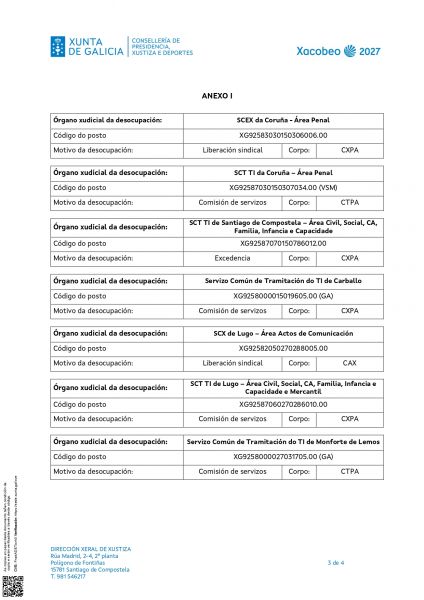 Producida a desocupación de diversos postos susceptibles de cobertura mediante substitución entre titulares, procedeuse a publicar a Resolución do 20 de febreiro de 2026 para a súa provisión temporal, de acordo co previsto na Resolución do 11 de decembro de 2025, pola que se regulan as substitucións entre persoal funcionario dos corpos xerais no ámbito da Administración de Xustiza de Galiza.